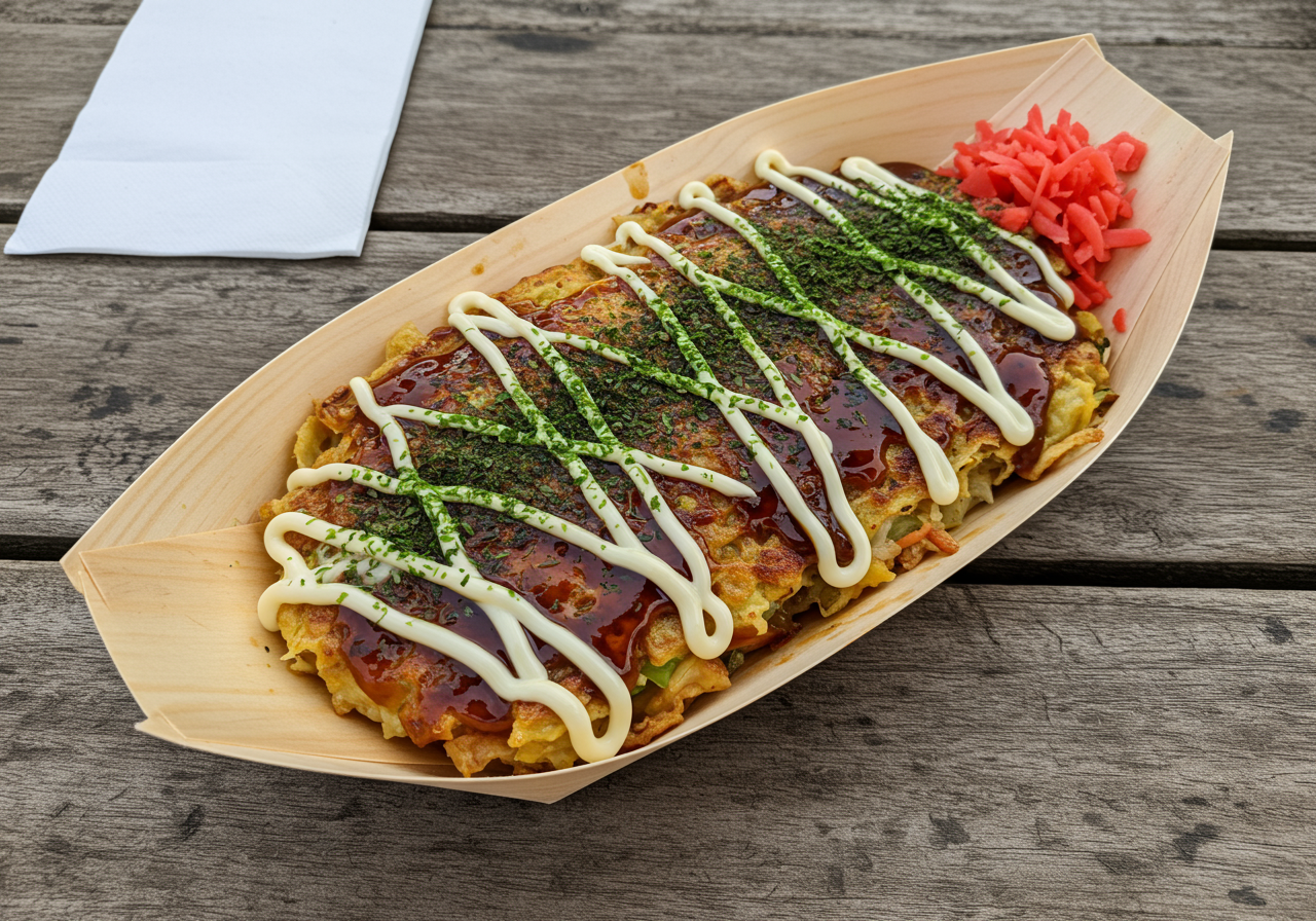 Customizable and savory Japanese pancakes, or okonomiyaki, are made from scratch by a very cool couple.
